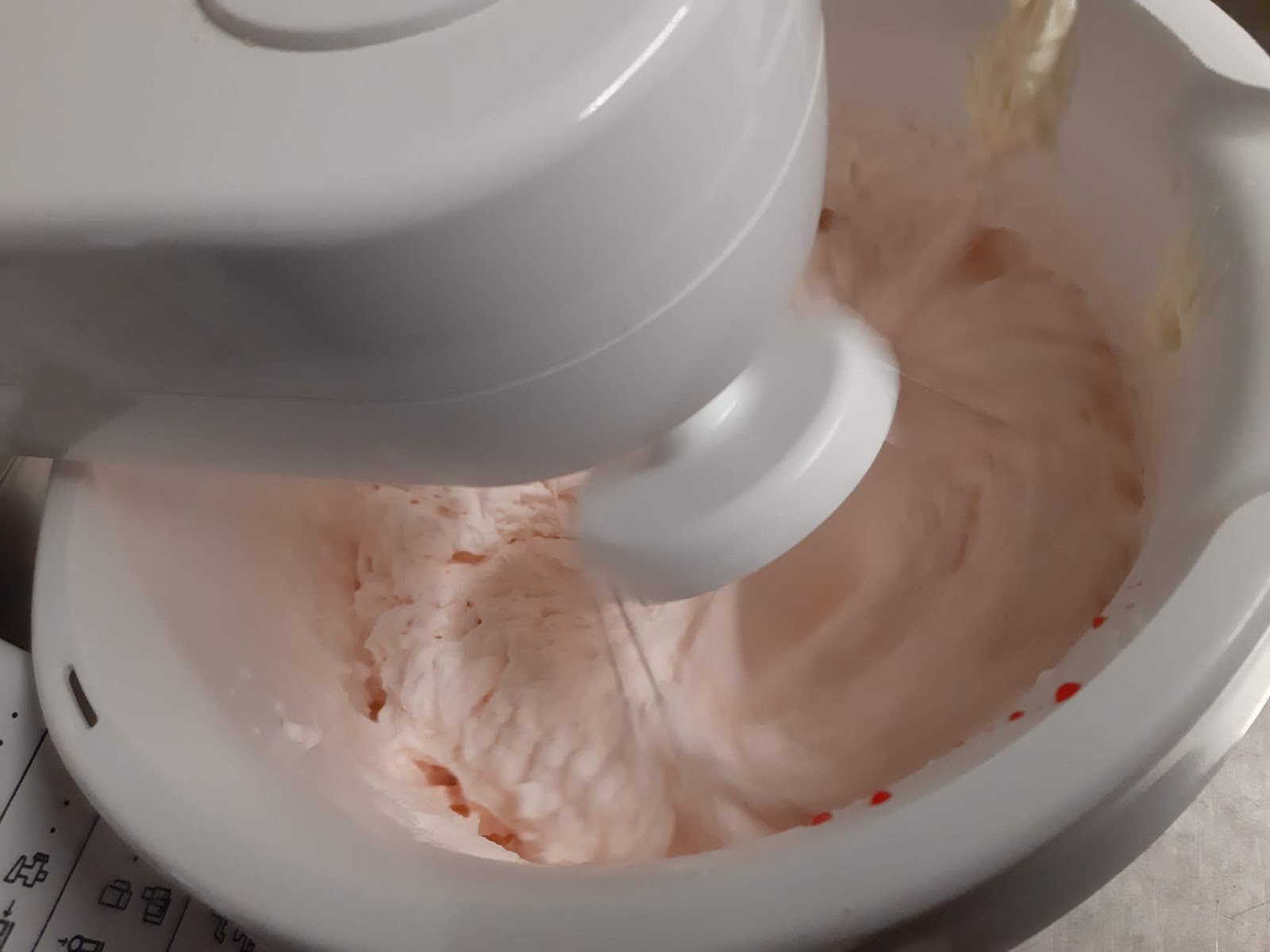 - Сметаната смесвам с втвърдителя, ваниловата захар и сиропа и разбивам докато миксерът започне да оставя следи в сметаната.