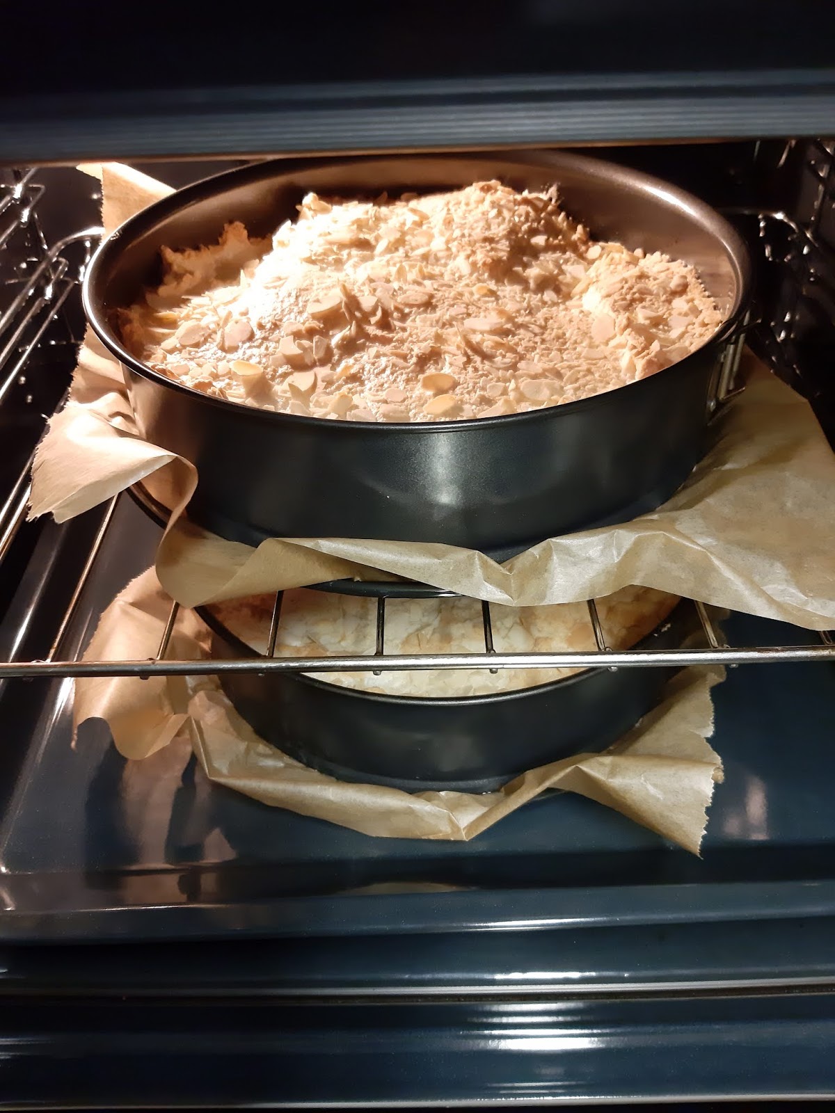 - Връщам и двете форми във фурната за още около 20 – 25 минути или до тъмно златисто оцветяване на бадемовите люспи.