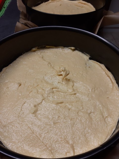 - Разпределям готовата смес в две предварително покрити на дъното с хартия форми за торти с размер 28 см в диаметър. Аз обичам и да намажа стените с олио за всеки случай.