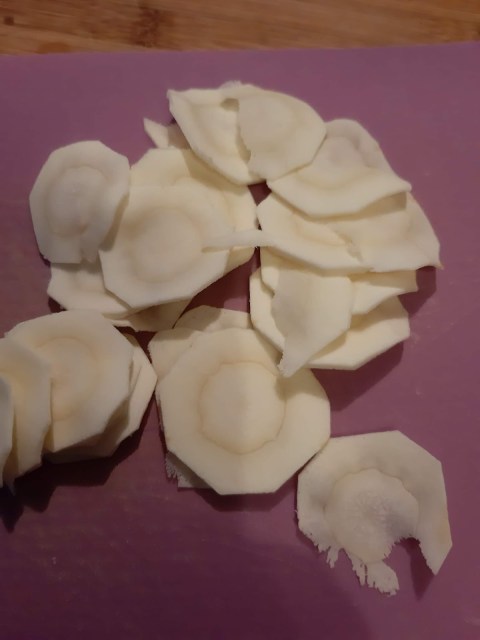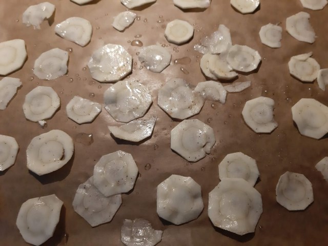 - Избирам един по-красив корен от пащърнак и нарязвам много на тънки филийки, почти прозрачни.
