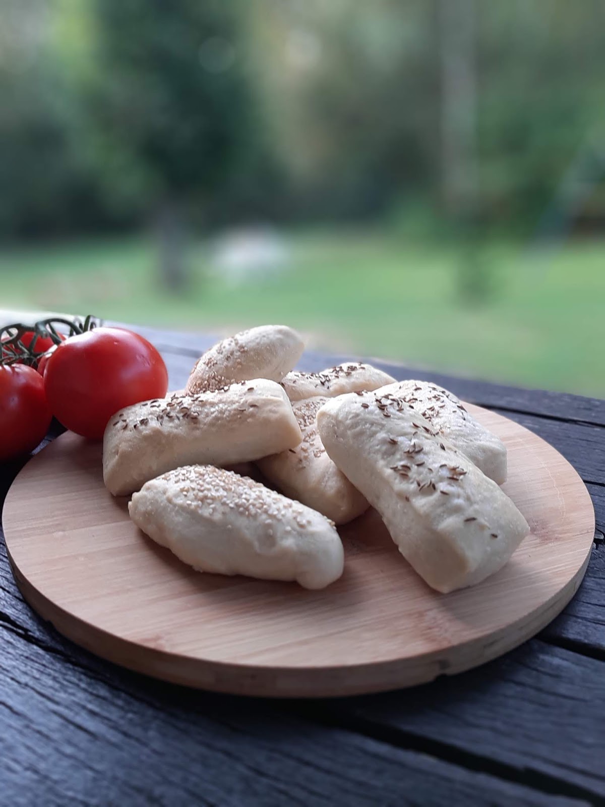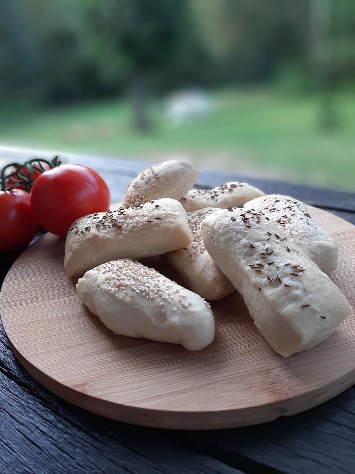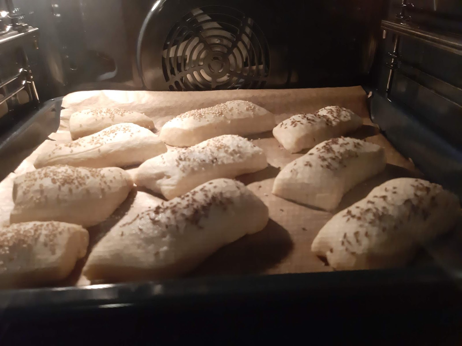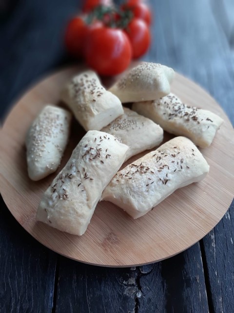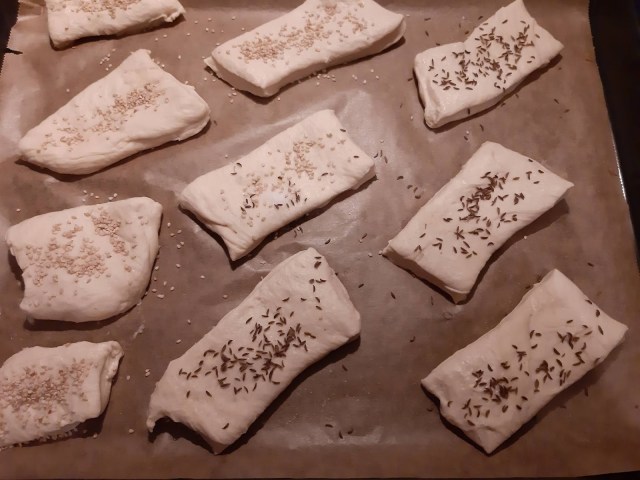 - Подредих хлебчетата в тава с хартия за печене, поръсих със сусам и ким, смесен с ситна морска сол и оставих няколко минути да си починат или докато фурната достигне 230 градуса, горно и долно печене. Не препоръчвам печене с вентилатор, но задължително направете пара, като на дъното на фурната сложите огнеупорна купа с вода, или просто включите на печене с пара, ако имате тази опция.