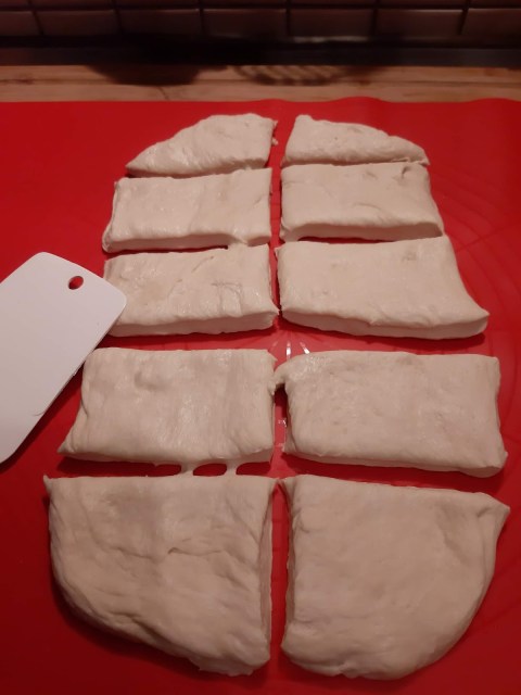 - После го изсипах върху плота, леко притиснах с ръце и с картата за тесто нарязах на 10 приблизително еднакви по големина парчета.