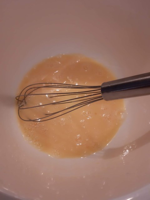 - От едното яйце отделих жълтъка за намазване и другите ги разбих в купа.