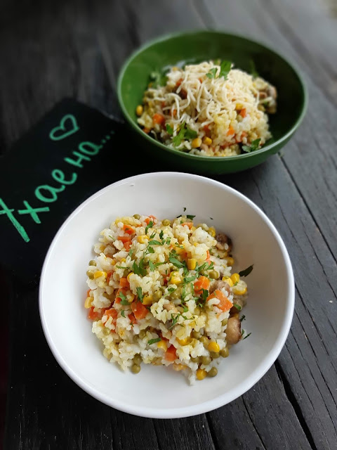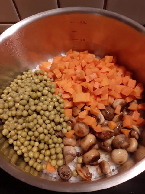- Когато оризът е поел цялата течност и като пипна зърната, и те се делят започвам да добавям зеленчуците.