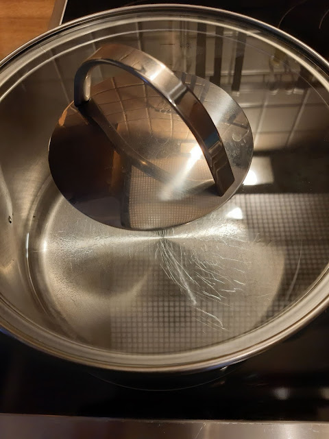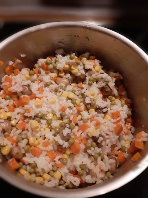 - Когато водата заври, изсипвам отмереното количество ориз, похлупвам и веднага намалявам котлона. Моите котлони са индукционни и затова е нужно да оставя на 2 степен, за да може да се поддържа някаква топлина на водата, но не се вижда бълбукане на водата.
