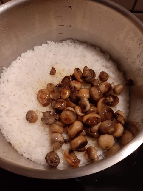- Добавям гъбите с цялата мазнина. Това е и единствената мазнина, която се добавя в готовото ястие. А тя дава една лъскавина на гарнитурата.