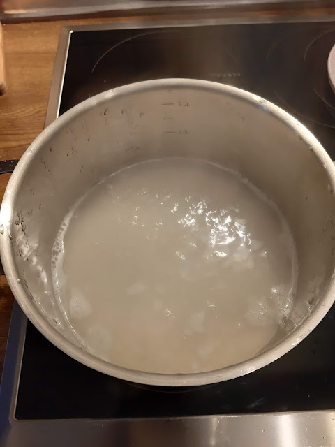 - Съотношението ориз /кръгъл/ – вода за моята свекърва, а и за мен също е винаги 1:3. Отмерих 900 мл вода и я оставих на котлона да заври.