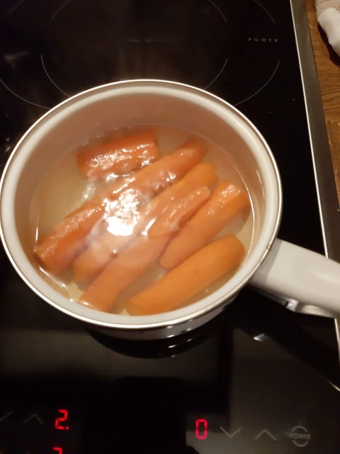 - През това време обелвам морковите и ги сварявам до полу-готовност. Ние обичаме да ни хрупкат леко.