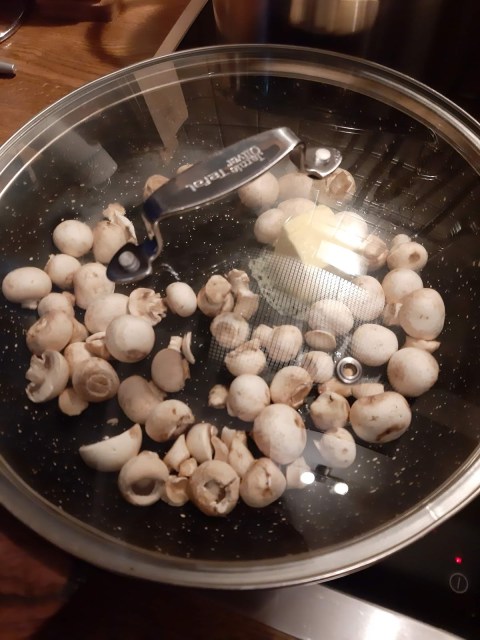 - Гъбите почиствам с четка и слагам в тиган с маслото. Задушавам под капак до готовност.