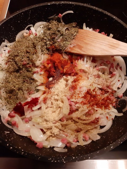 - Започнах първо с подготовката на лука, като го нарязах на лентички и заедно с бекона, и превареното масло, както и малко водичка го задуших до омекване.