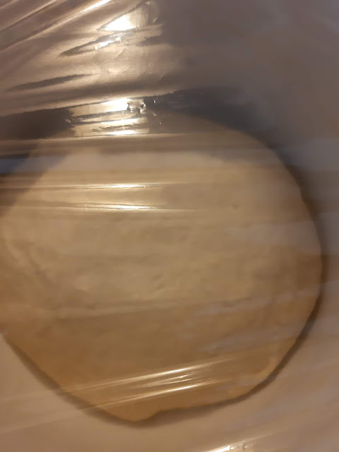 - Оформих тестото на топка, оставих в купата и покрих с фолио за свежо съхранение. Изчаках около 30 – 40 минути или докато тестото напълни купата.