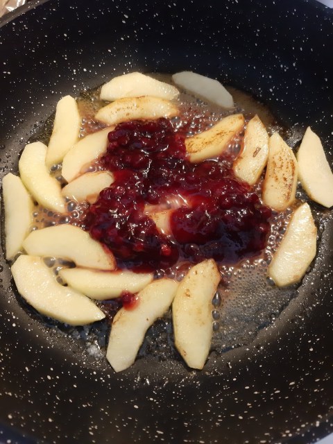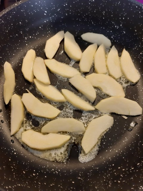 - През това време обелих, почистих ябълките и ги нарязах на тънки резенчета, които изпържих в 20 гр масло за около 2 минути от всички страни.