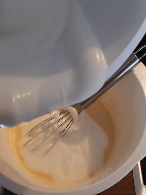 - Добавих щипка сол към белтъците и разбих до пяна, после добавих на един път 75 гр захар и продължих с разбиването. Белтъците не е нужно да са на твърд сняг, по-скоро са леко течно, но все пак снежни.