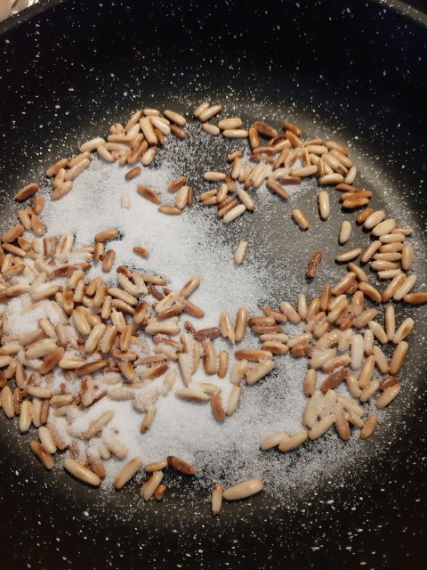 - Поръсих с останалата захар и останалото масло. Разбърках и добавих и кедровите ядки. Оставих на котлона за около 1 минута.