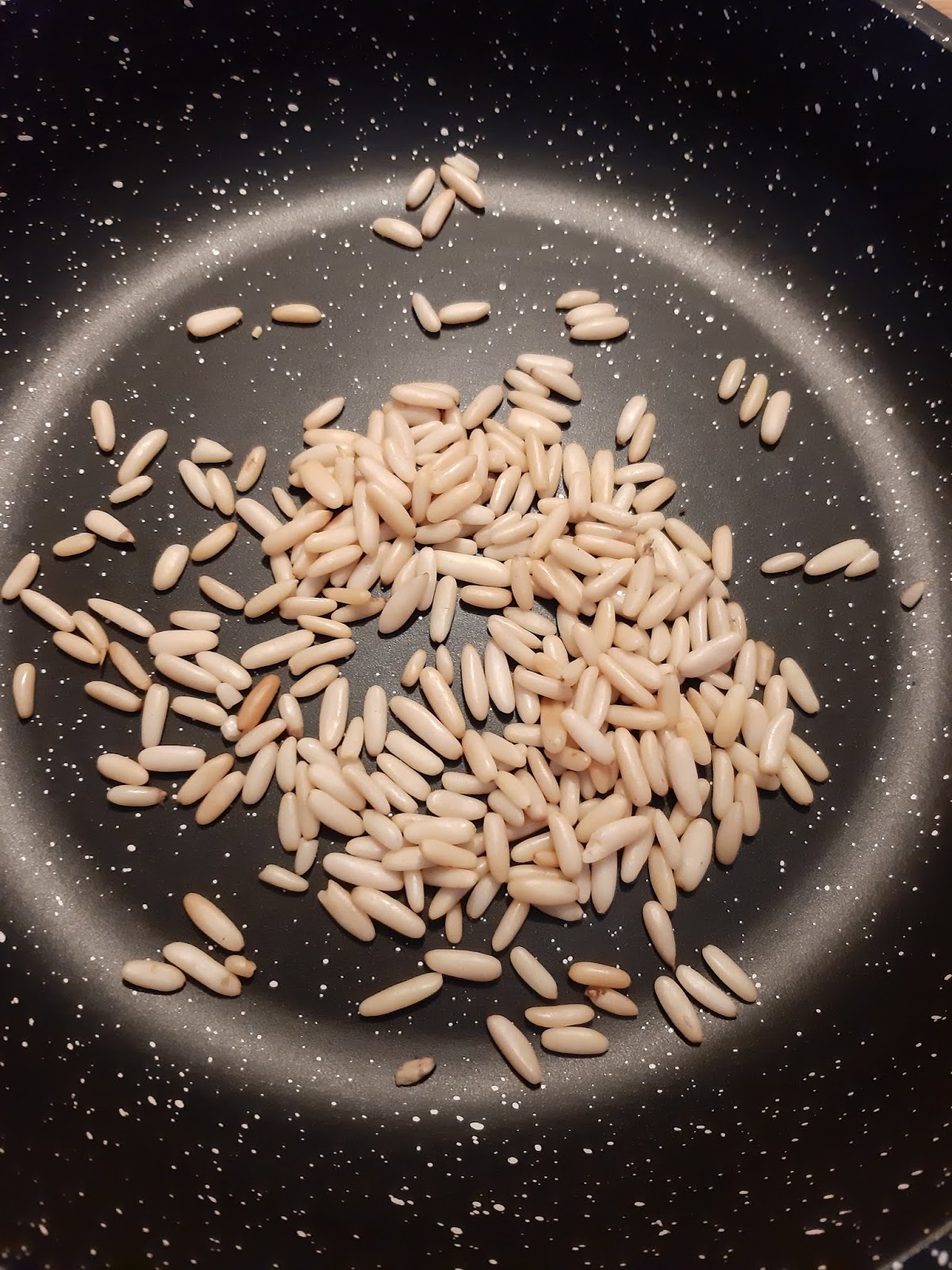 - Поръсих с останалата захар и останалото масло. Разбърках и добавих и кедровите ядки. Оставих на котлона за около 1 минута.