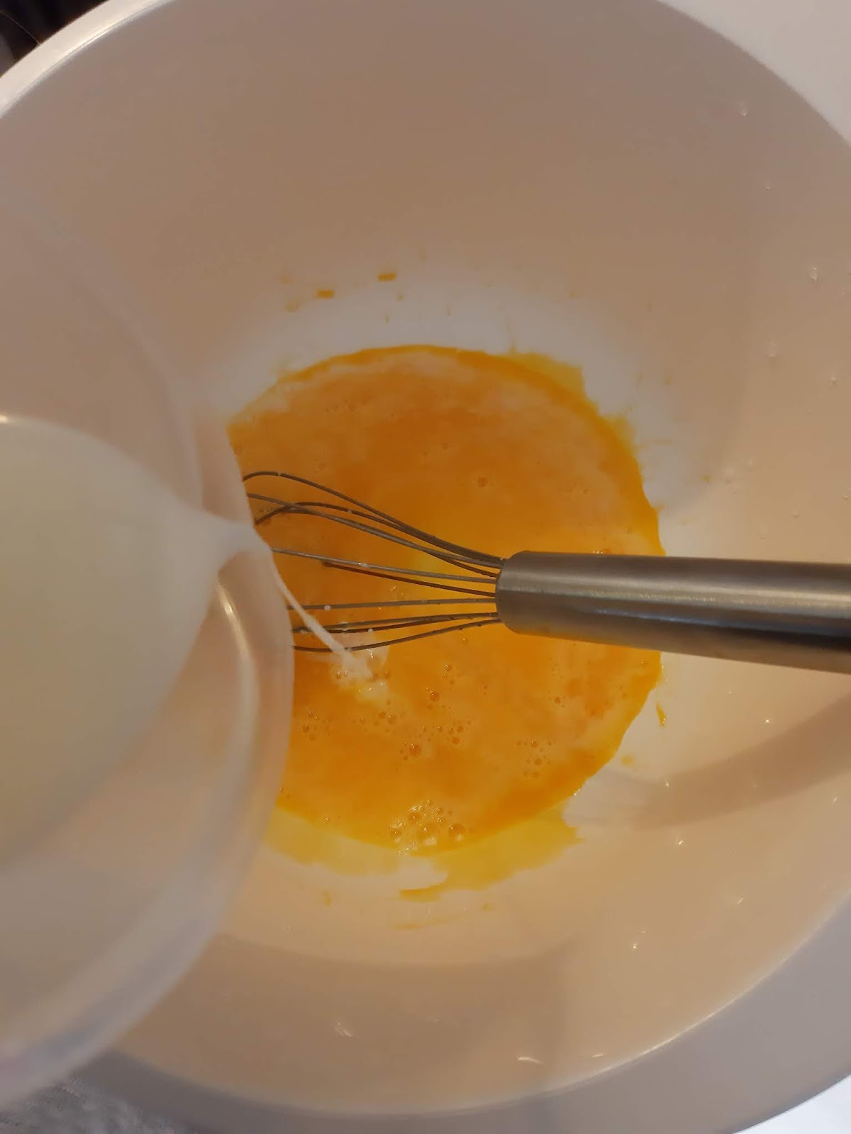 - Жълтъците разбих и към тях постепенно добавях прясно мляко …