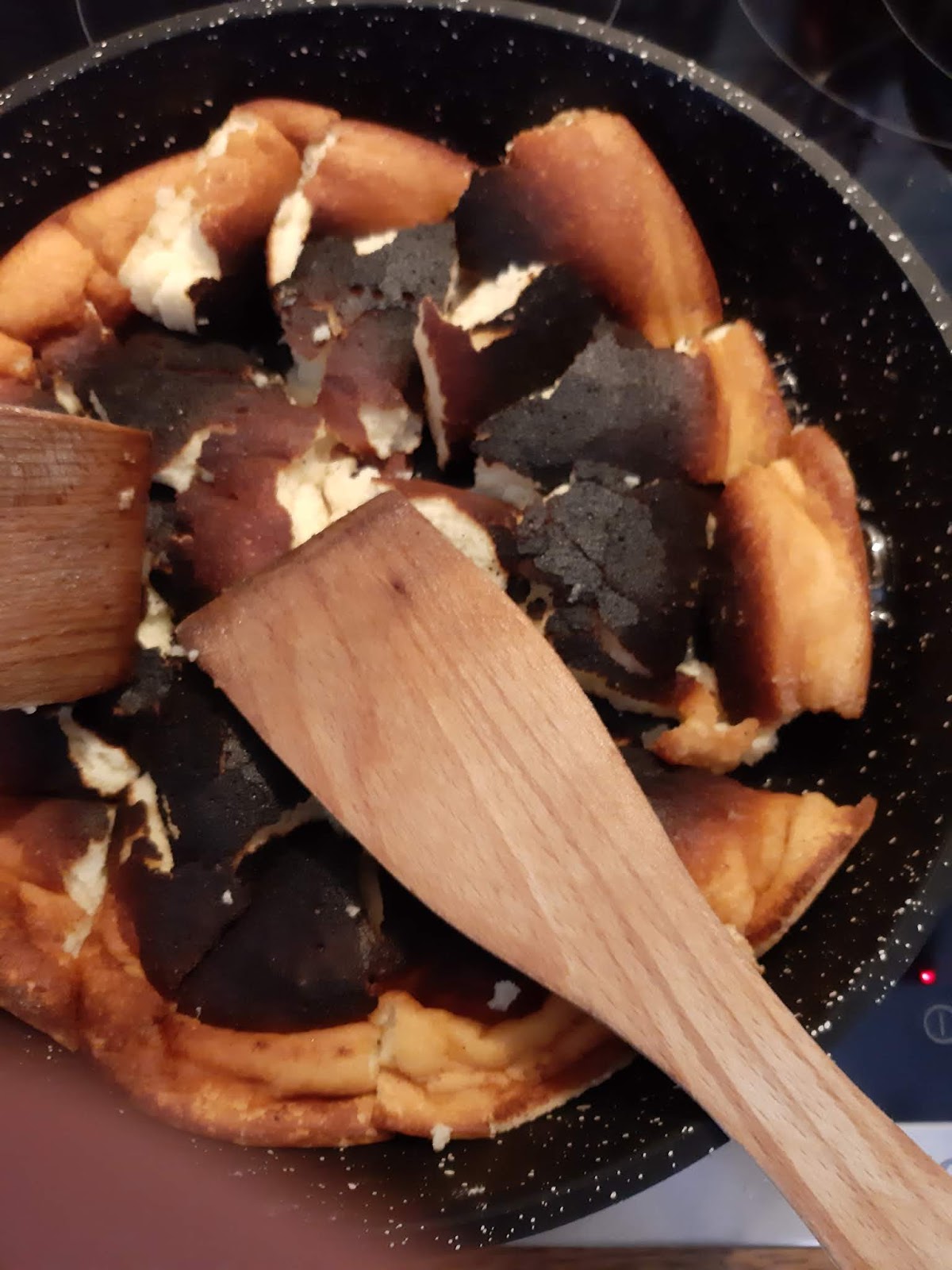 - Около 2 с. л. от маслото разтопих в тигана и излях цялата смес за кайзершмарен.