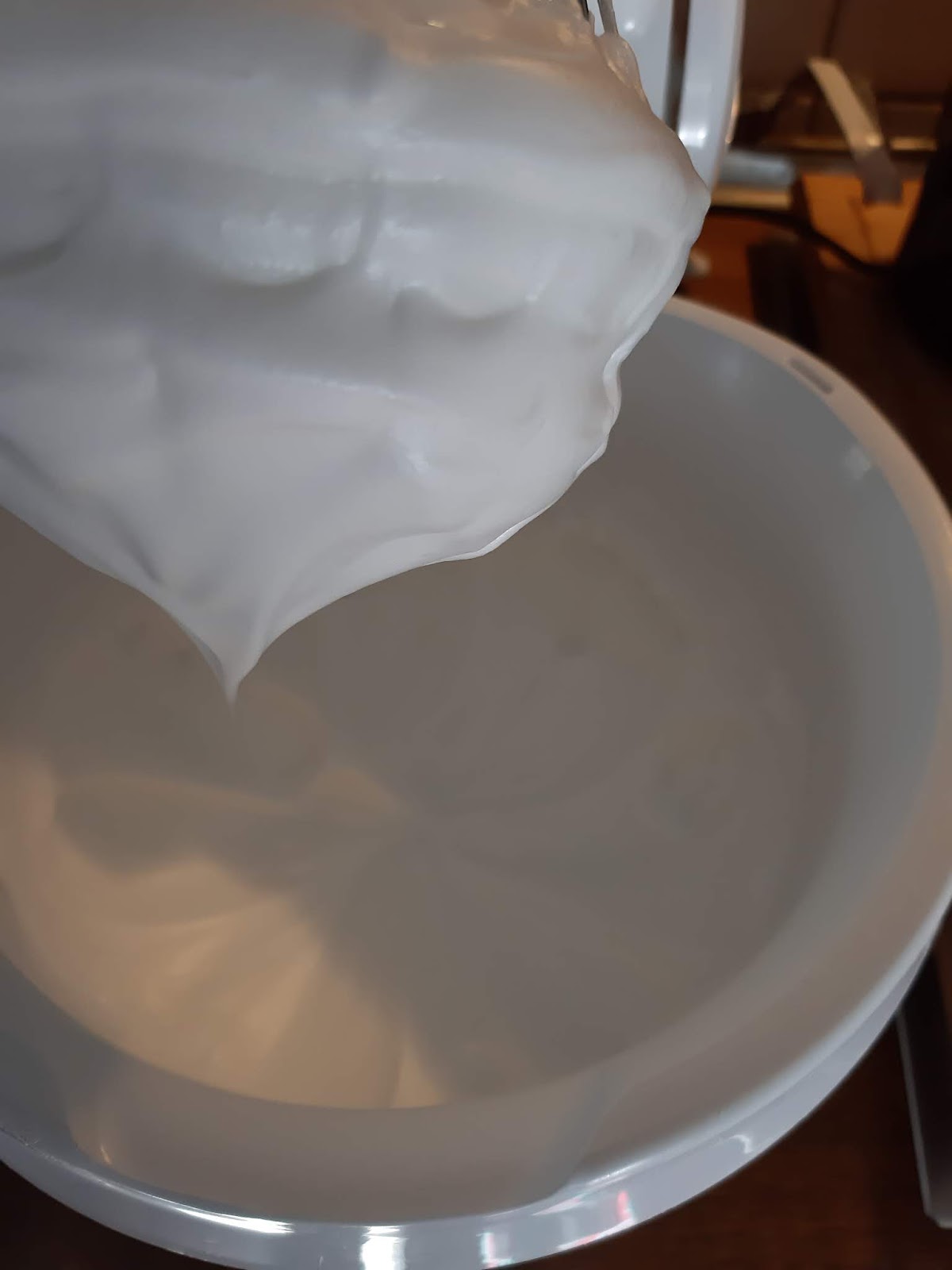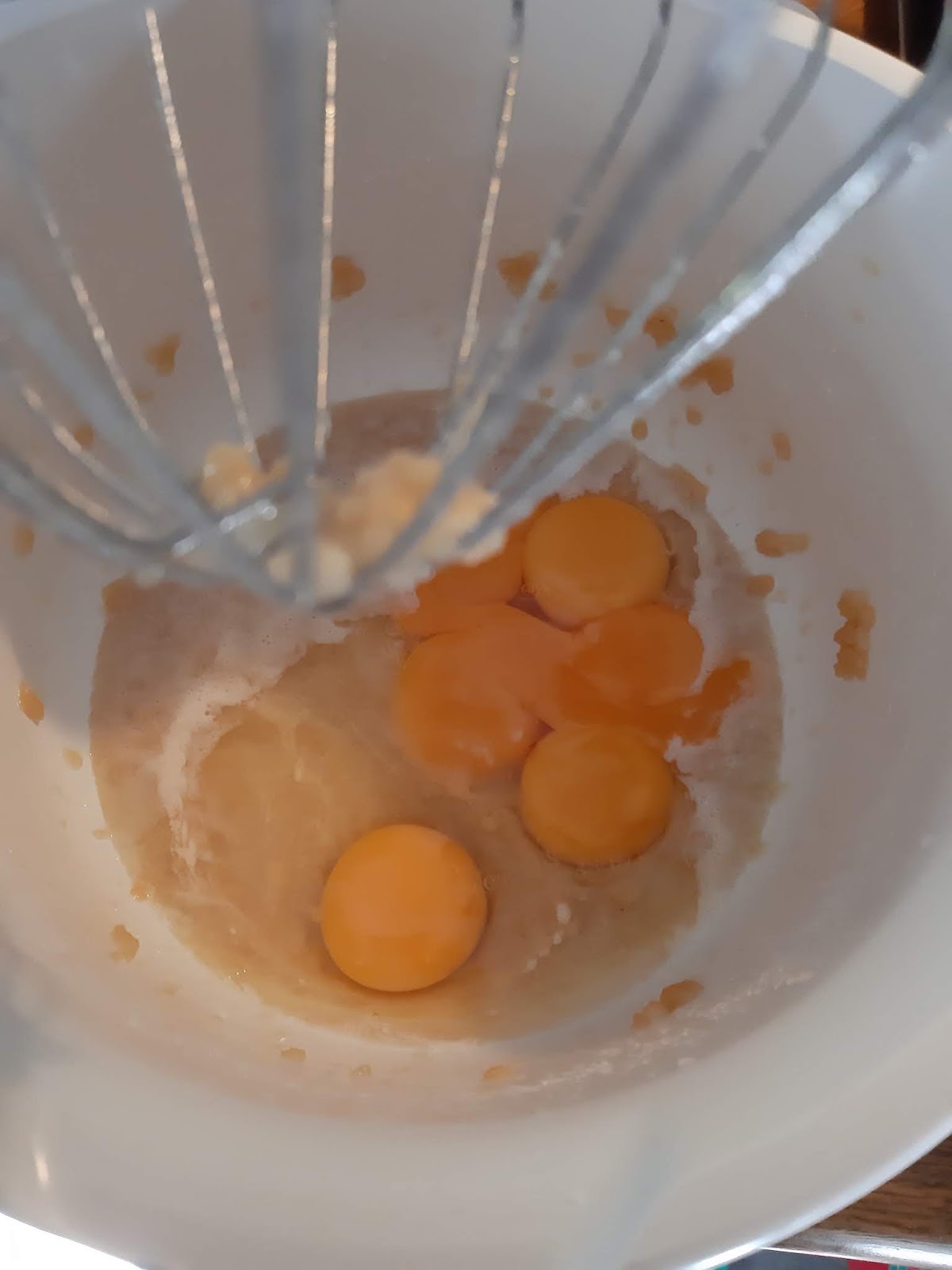 - Четирите белтъка разбивам с миксер на сняг и добавям малко по малко захарта.