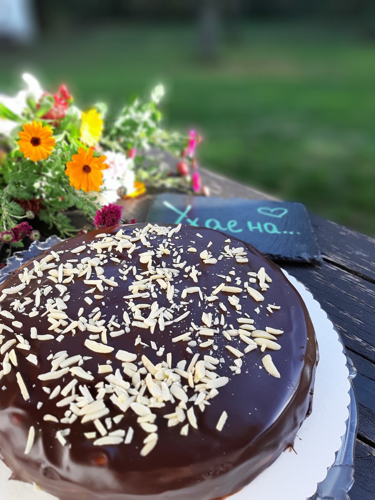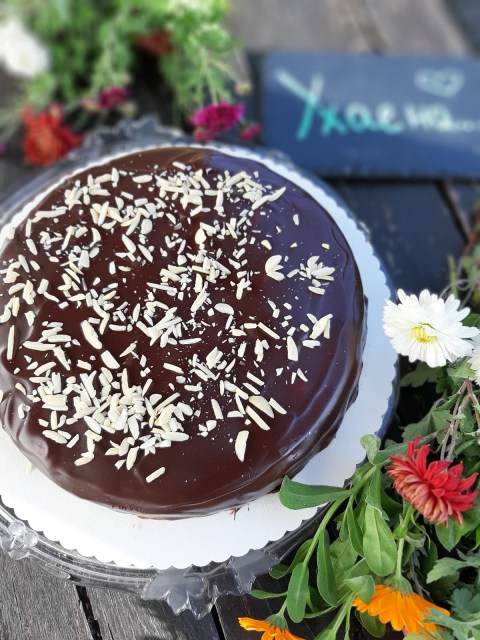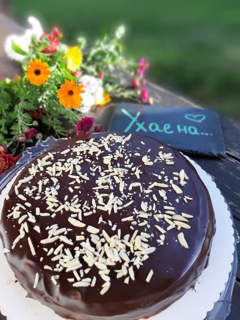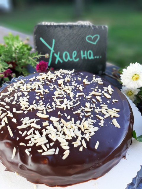 - Шоколада за надписа разтопявам в микровълновата и после с помощта на шишенце с накрайник правя надписи, но когато е за домашна употреба, само поръсвам с бадеми.