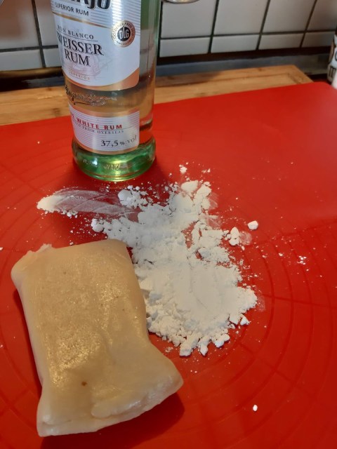 - Марципана за декорацията омесих с рома и пудрата захар.
