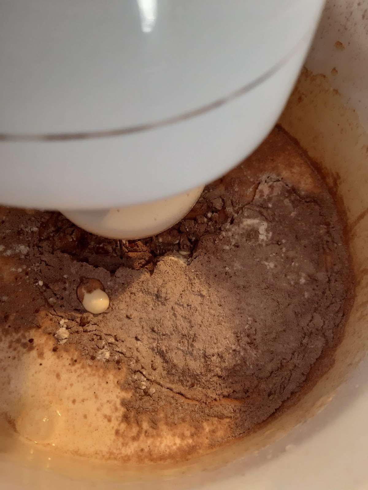 - Добавям сухата смес към крема и бъркам кратко на ниска степен.