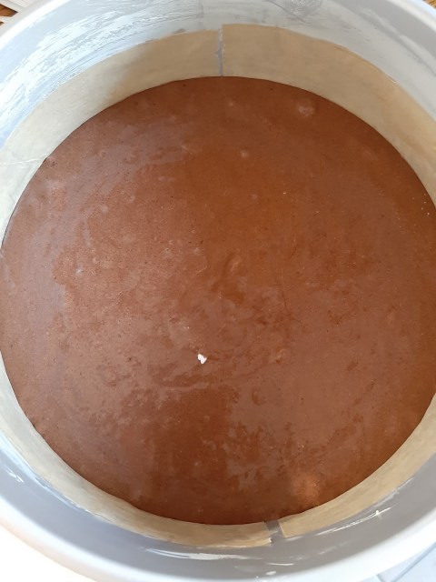 - Готовата смес изсипвам в подготвената форма. Височината на сместа не е много. Не се безпокойте, че е толкова малко. Торта Сахер е като Гараш – около 4 см височина в готов вид.