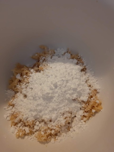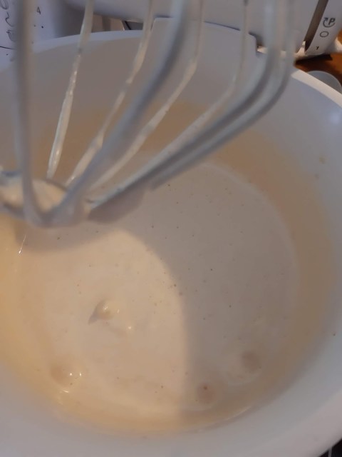 - Добавям пудрата захар и 65 мл вода. Разбивам с миксера на пухкава смес.