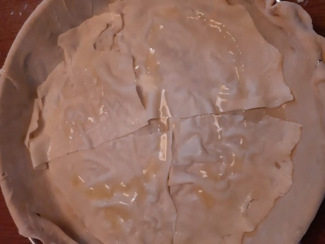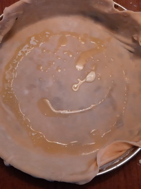 - Разточих кората с размер по-голям от този на тавата така, че краищата да висят от тавата.