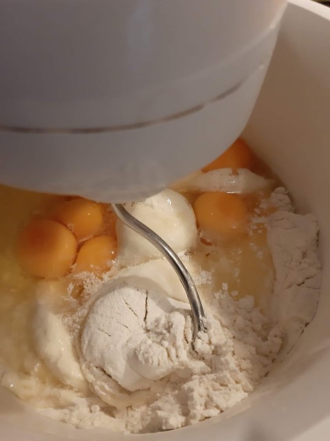 - Добавих солта и всичките яйца. Месих тестото не по-малко от 10 минути като ми се наложи да добавя и брашно. Останалото брашно ми беше нужно за поръсване по време на разточването на корите.