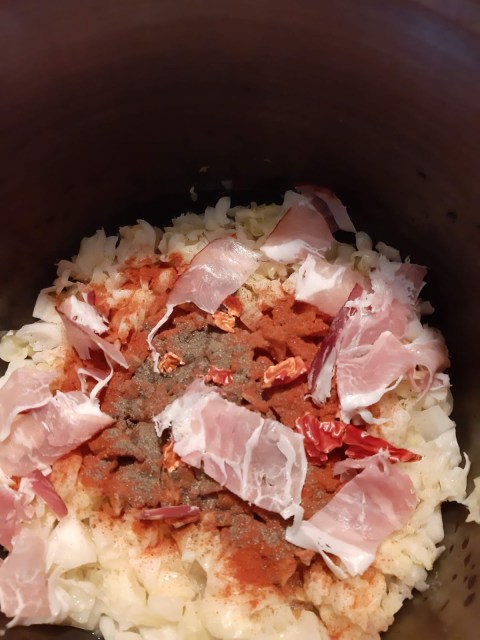 • Върху последния слой зеле наръсвам всички подправки и подреждам нарязания бекон.