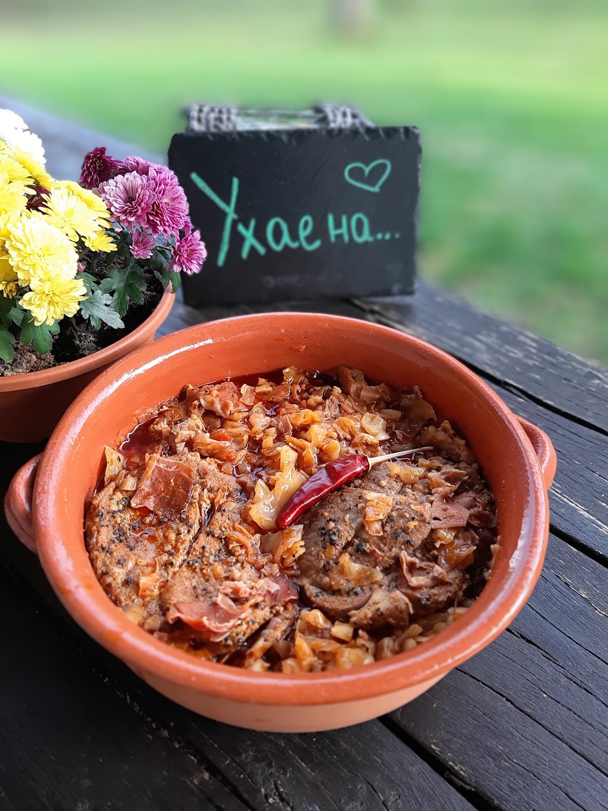 Второто изискване е много мас, малко сланинка , малко беконче, вкусни свински вратни пържоли и люта чушчица.