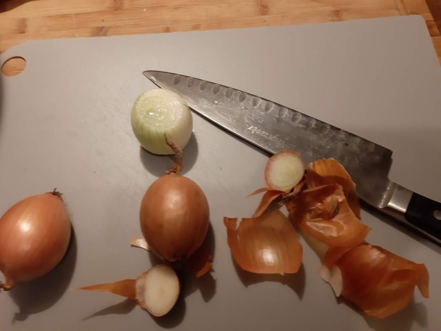 - Кромидия лук или шалот /ако имате/ обелвам и нарязвам само на четири.