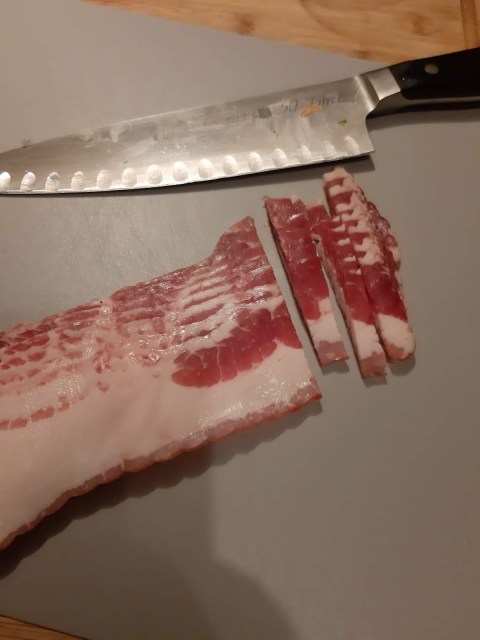 - Моят бекон е на тънки ленти, които режа на още по-тънки лентички.