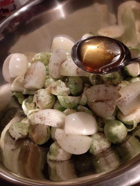 - Подправям със сол, черен пипер, олио, мед и малко бибер.