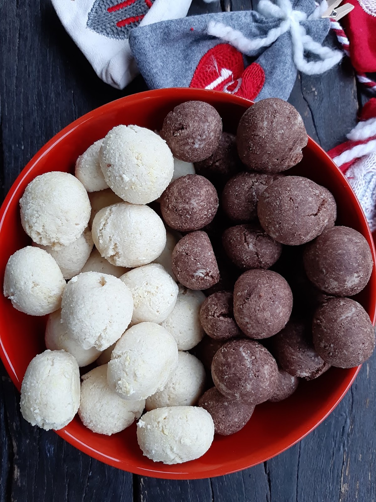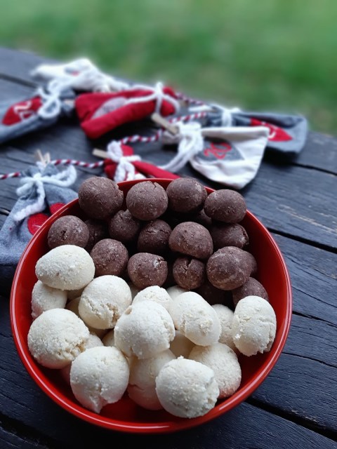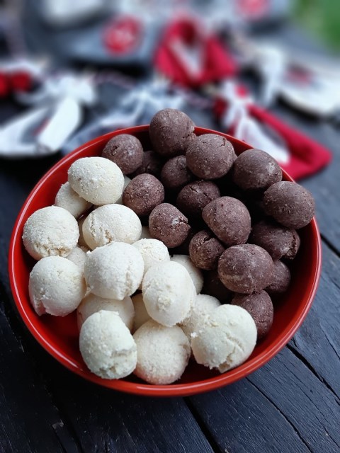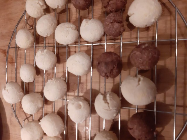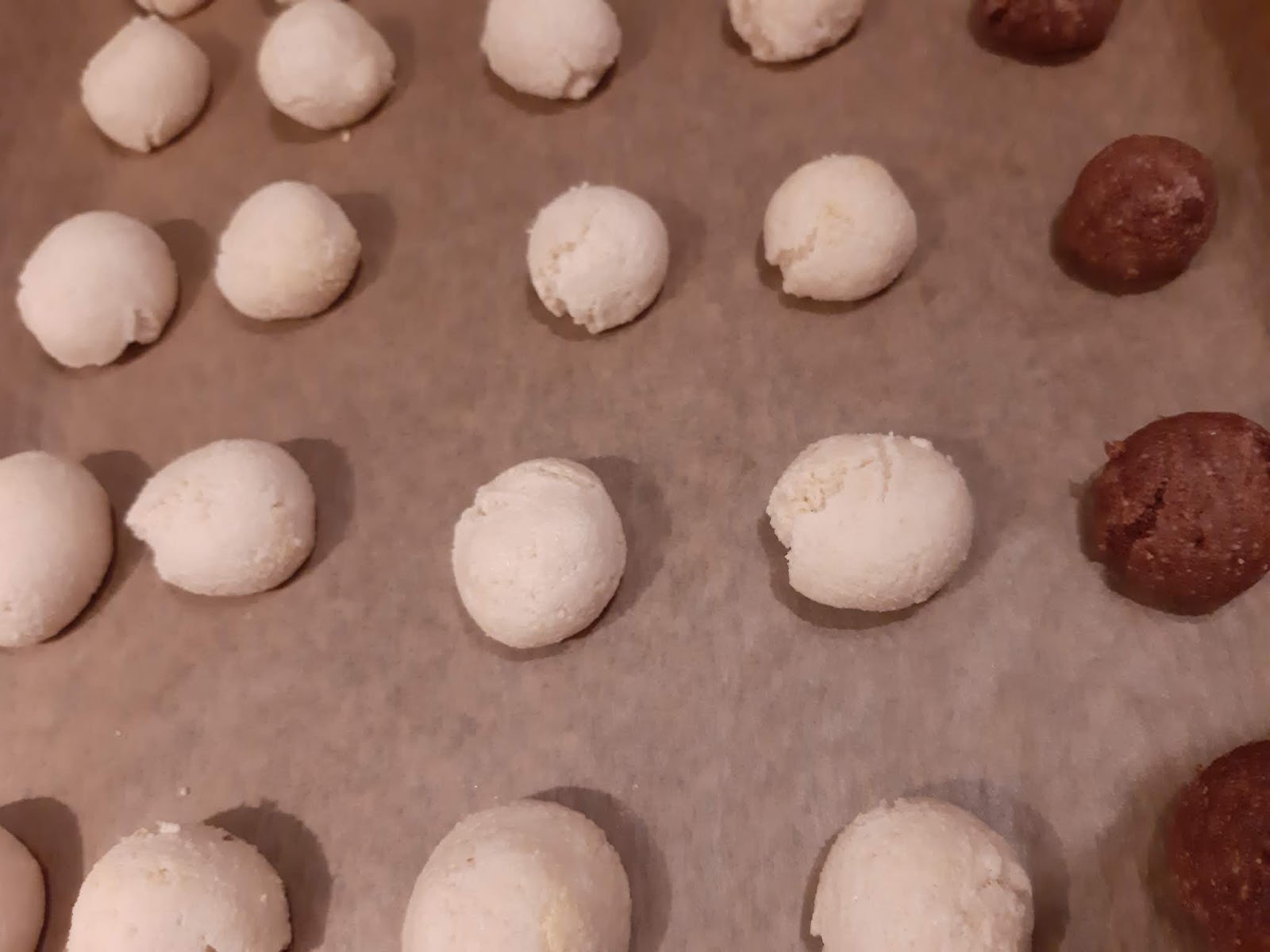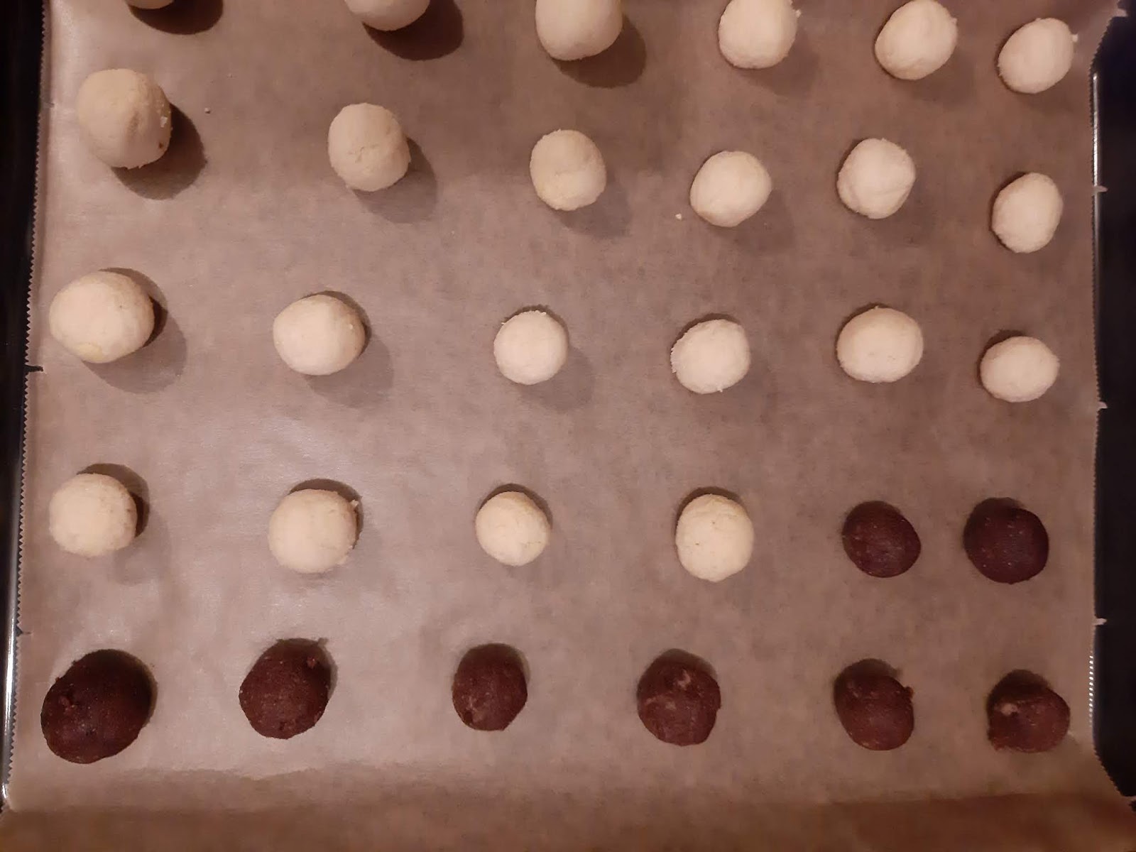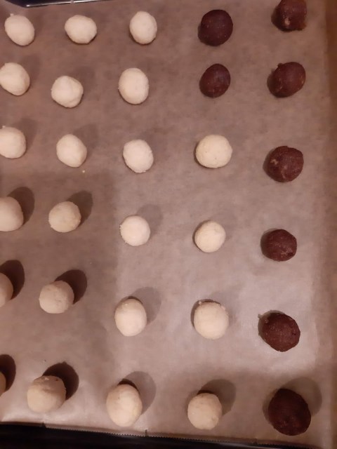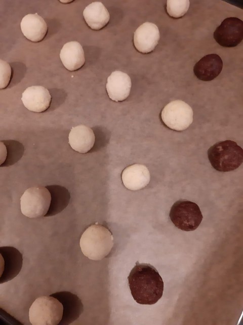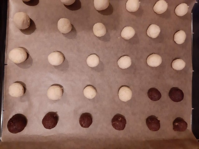 - От всяко тесто офорям с ръце топчета с размер на голям лешник и ги поставям в тава с хартия за печене.