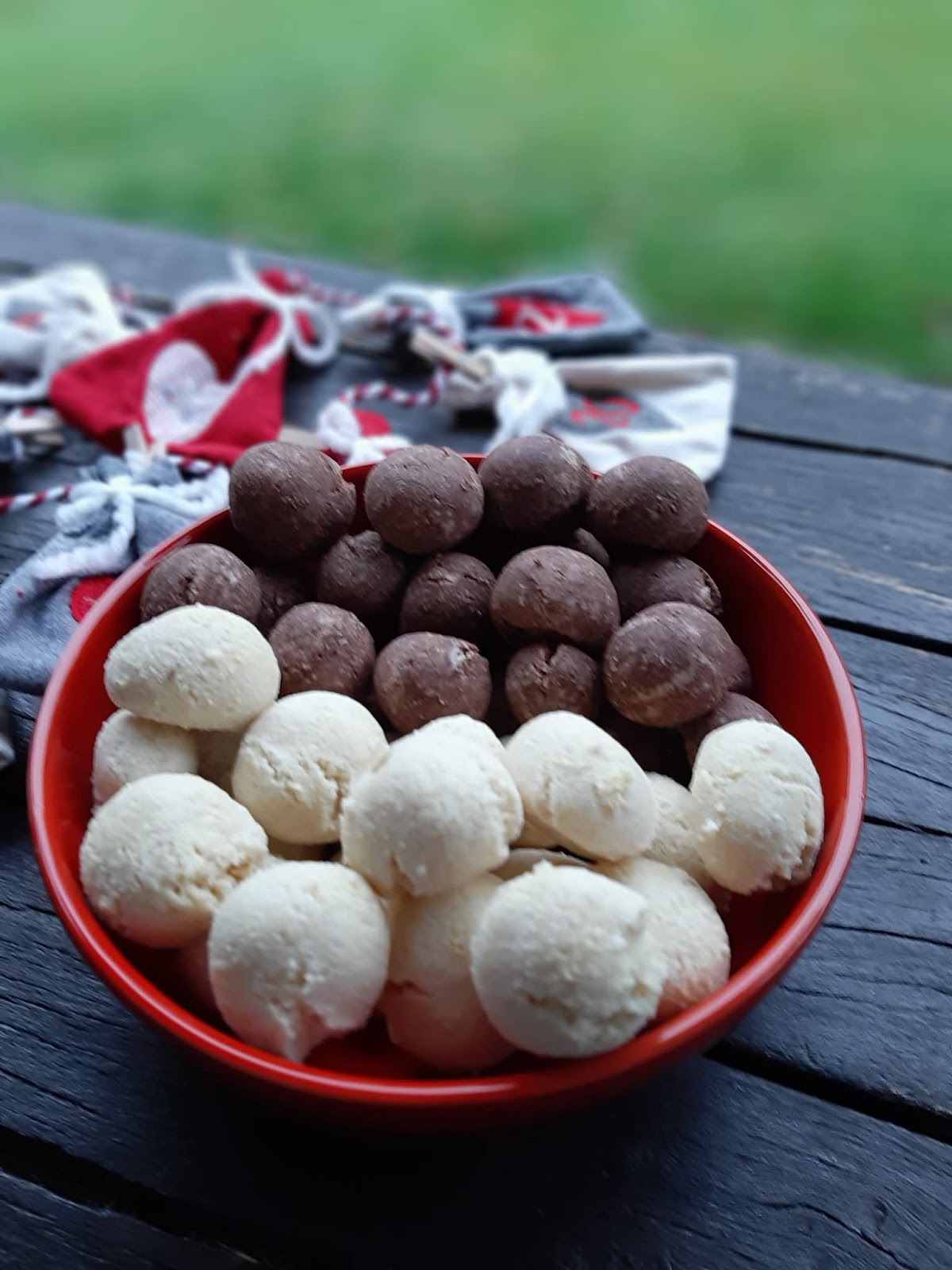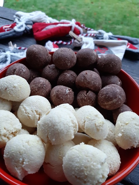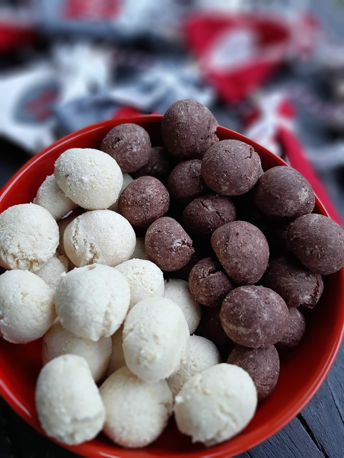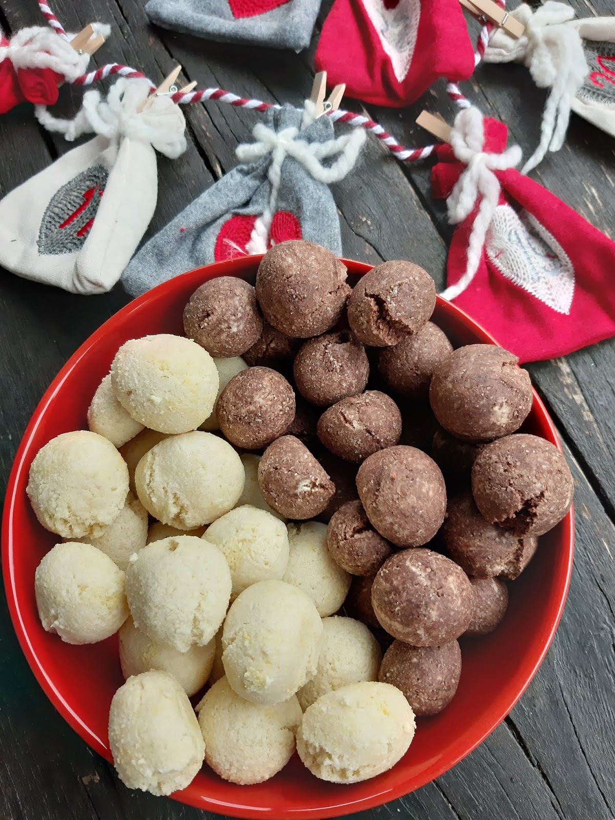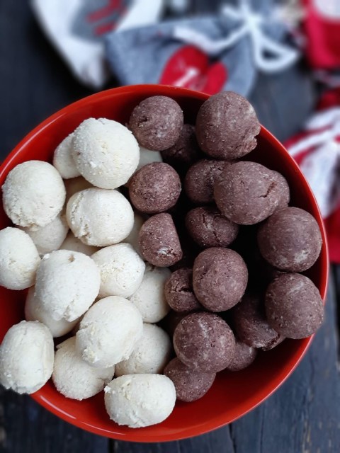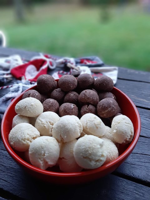 - От всяко тесто офорям с ръце топчета с размер на голям лешник и ги поставям в тава с хартия за печене.