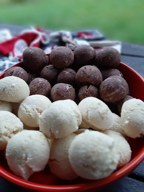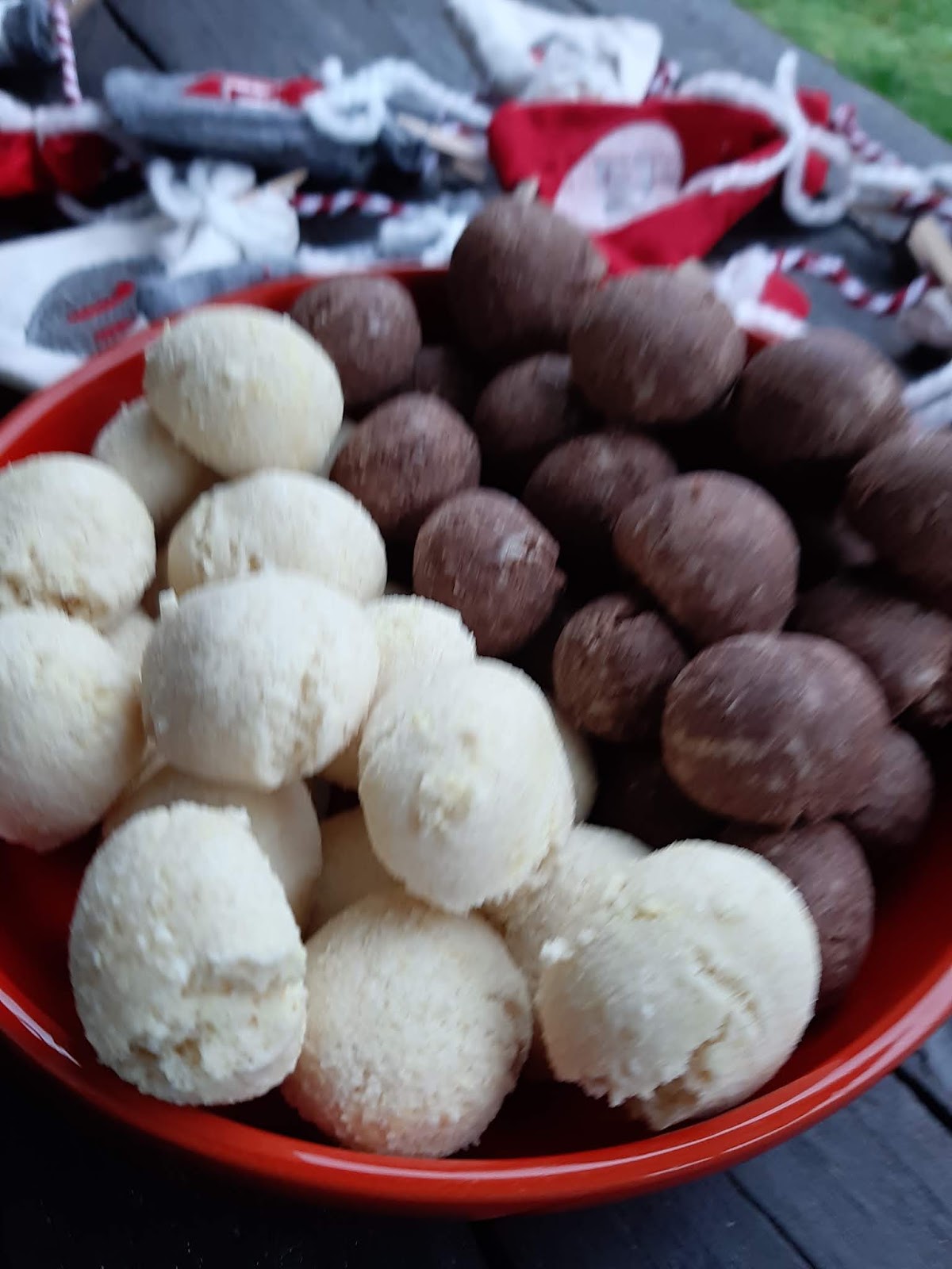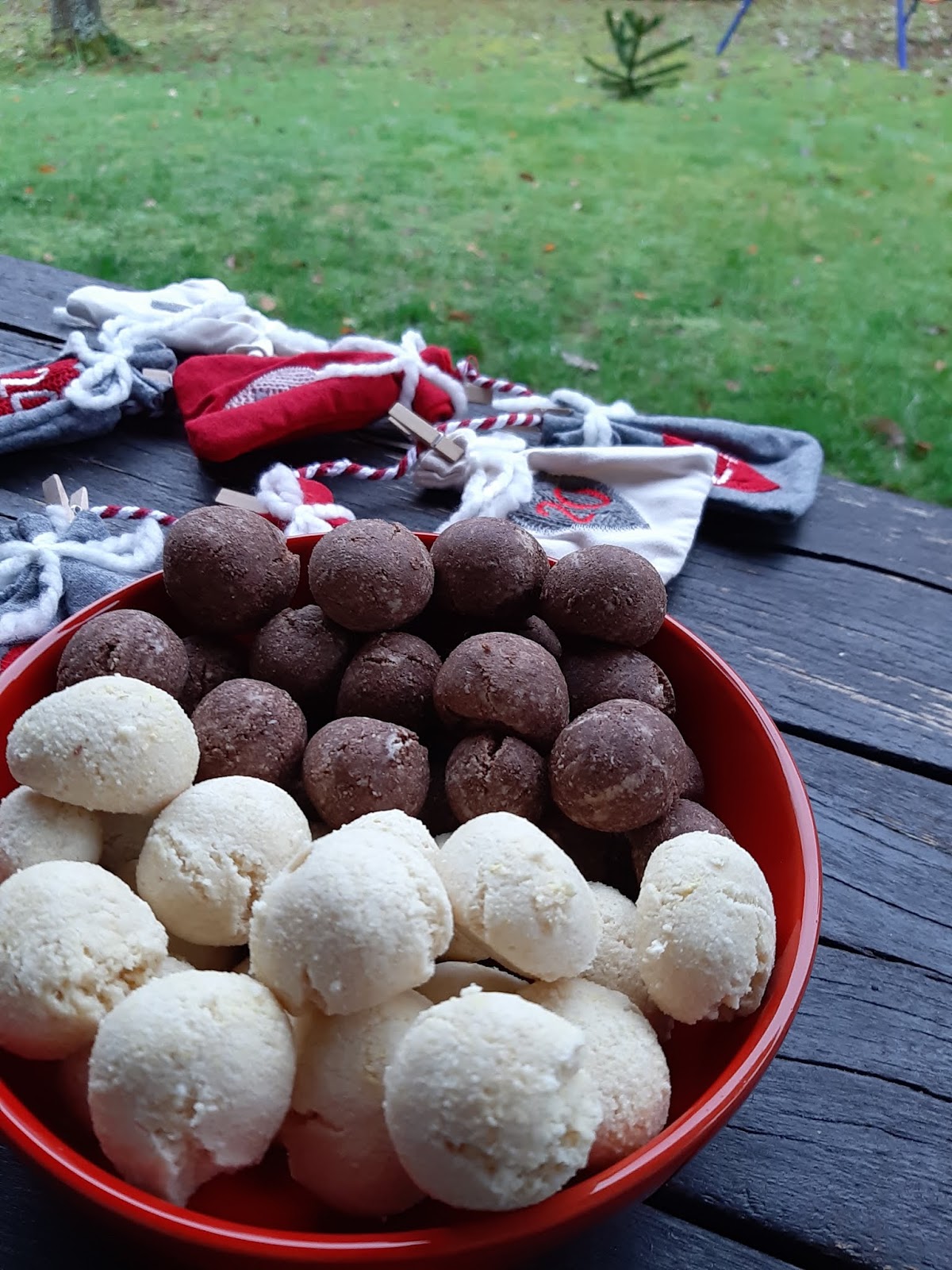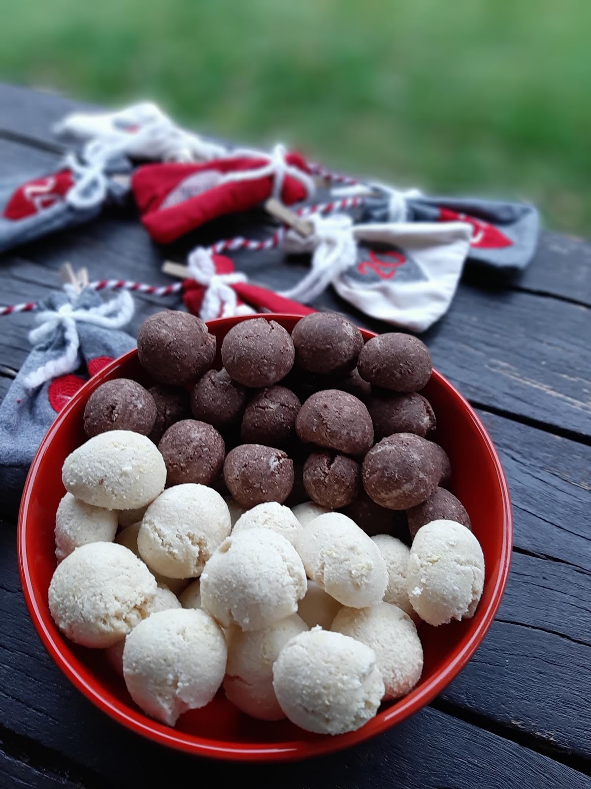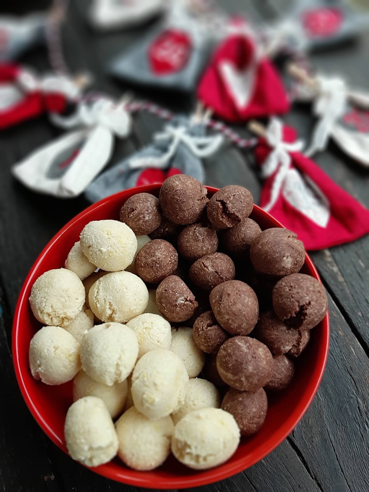 - От всяко тесто офорям с ръце топчета с размер на голям лешник и ги поставям в тава с хартия за печене.