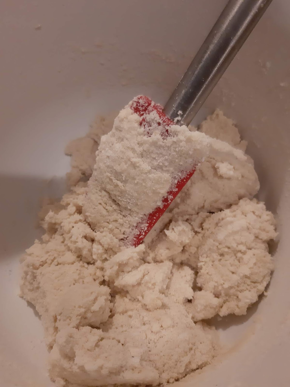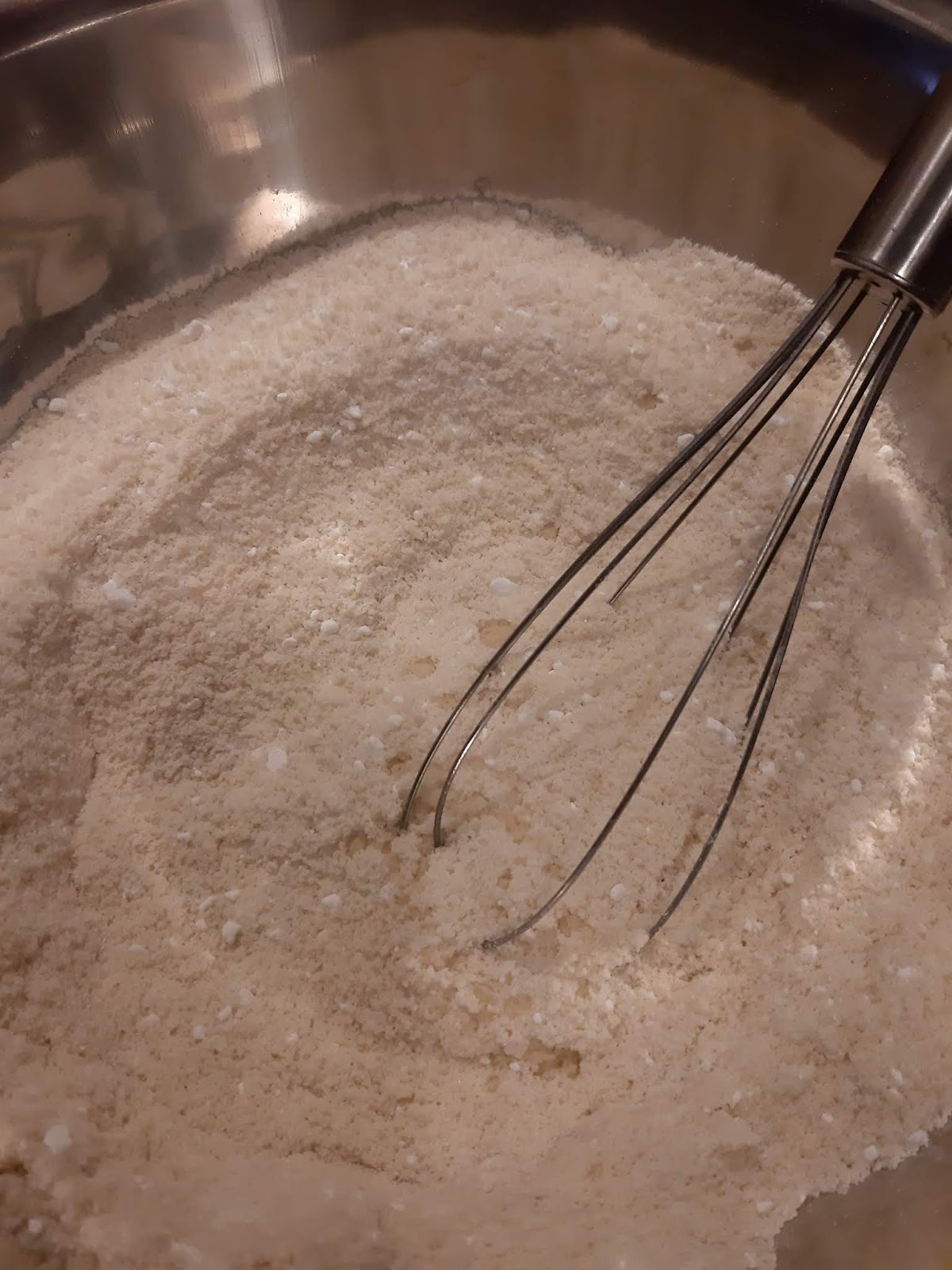 - На три – четири пъти сипвам от сухата смес към белтъците и бъркам бавно и нежно.