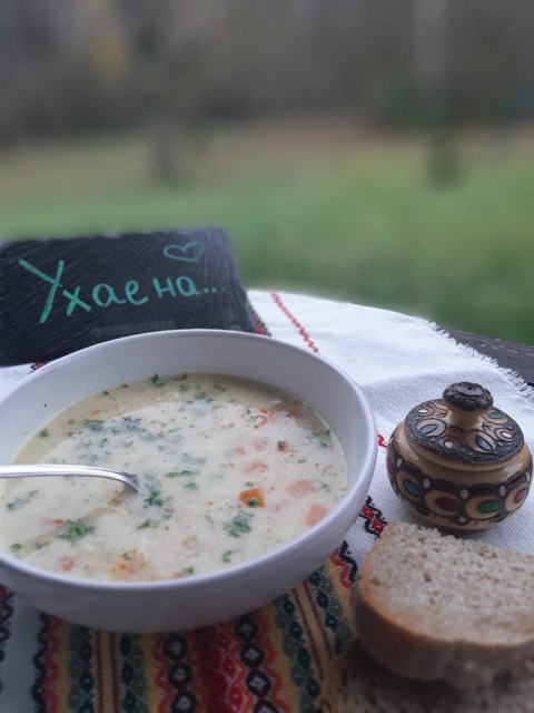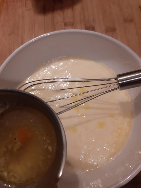 • Изключвам супата и с черпак загребвам от бульона. На тънка струйка добавям към яйцето и киселото мляко като не спирам да бъркам с тел. И така, докато понапълня купата и уравновеся температурата на застройката и температурата на супата. Така не ми се пресича яйцето. Не е трудно. Важното е да не бързате.