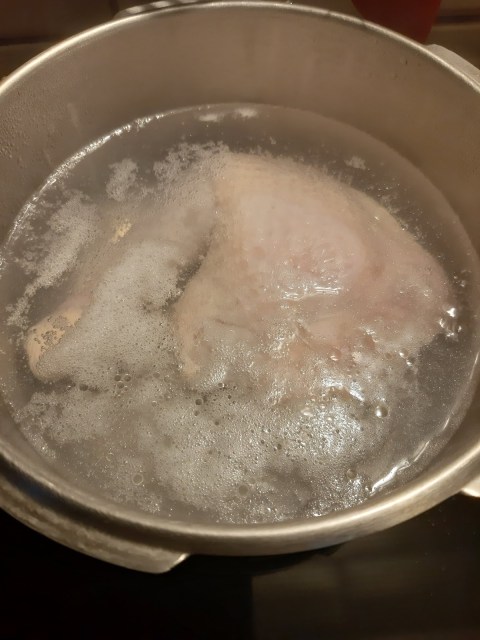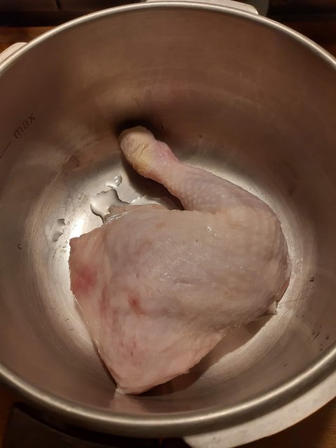 • Измивам много добре пилешкото бутче и премахвам останалите пера и излишните мазнини. Някои от Вас могат да предпочетат и да премахнат изцяло кожата, но да знаете, че точно там са и най-вкусните мазнини за една пилешка супа. Така, че аз предпочитам да изчистя всичко много добре и да оставя кожата.