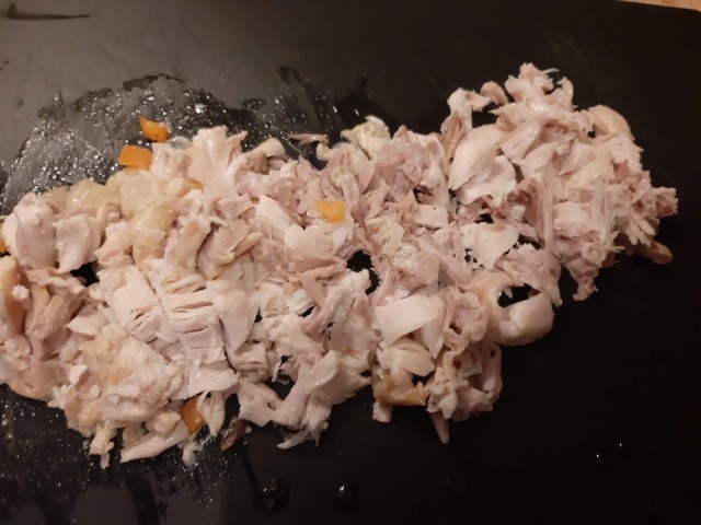 • Изчаквам месото да се охлади, обезкостявам и нарязвам на ситно. Може и да го накъсате, но на мен все още ми пари на пръстите и затова предпочитам нарязване.