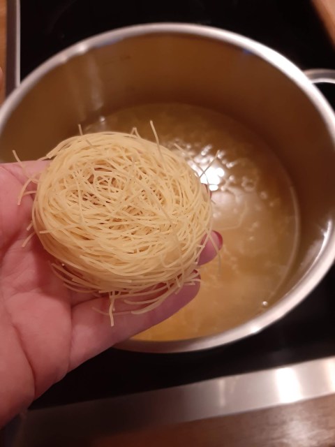• Добавям половин руло фиде. Аз винаги купувам фиде на руло, защото мога лесно да си го дозирам. В случая използвам половин руло, но го начупвам с ръка, преди да го пусна в супата. В противен случай остават дълги като спагети фидета.