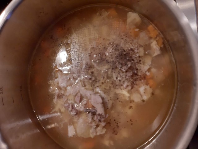 • Връщам месото към супата и подправям със сол и черен пипер.