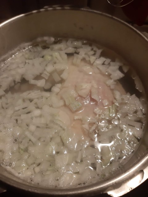 • Щом водата заври, добавям нарязания на малки кубчета кромид лук.