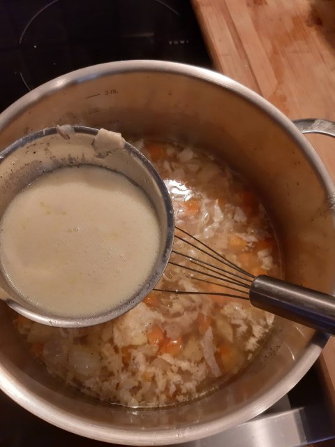 • После започвам с черпак след черпак да връщам застройката към супата, но пак не спирам да разбивам супата с тел. Така мама ме е учила, така аз съм учила моите дъщери, така се надявам и Вие да направите!