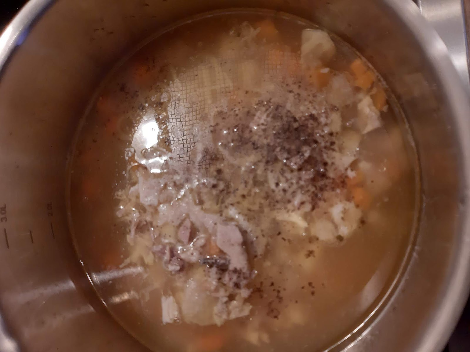 • С помощта на решетъчна лъжица премахвам пяната. Мама казваше – препенвам супата. Това се прави винаги, когато ще се вари месо /каквото и да е/, без предварително да е запържено в малко мазнина. Целта е бульонът от това месо да остане бистър.