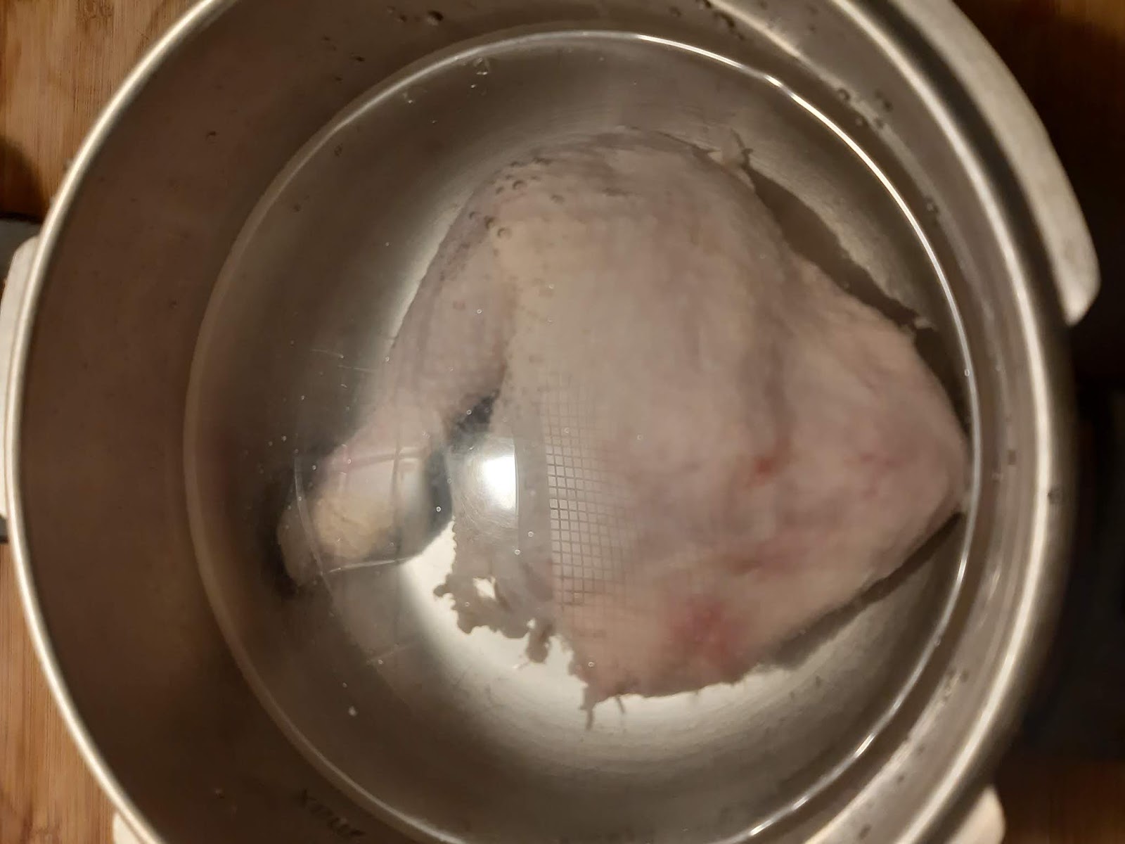 • Слагам бутчето на дъното на тенджерата. За спестяване на време използвам тенджера под налягане, с което намалявам времето за сваряване до 30 минути. В нормалната тенджера е нужен 1 час за сваряване на месото.