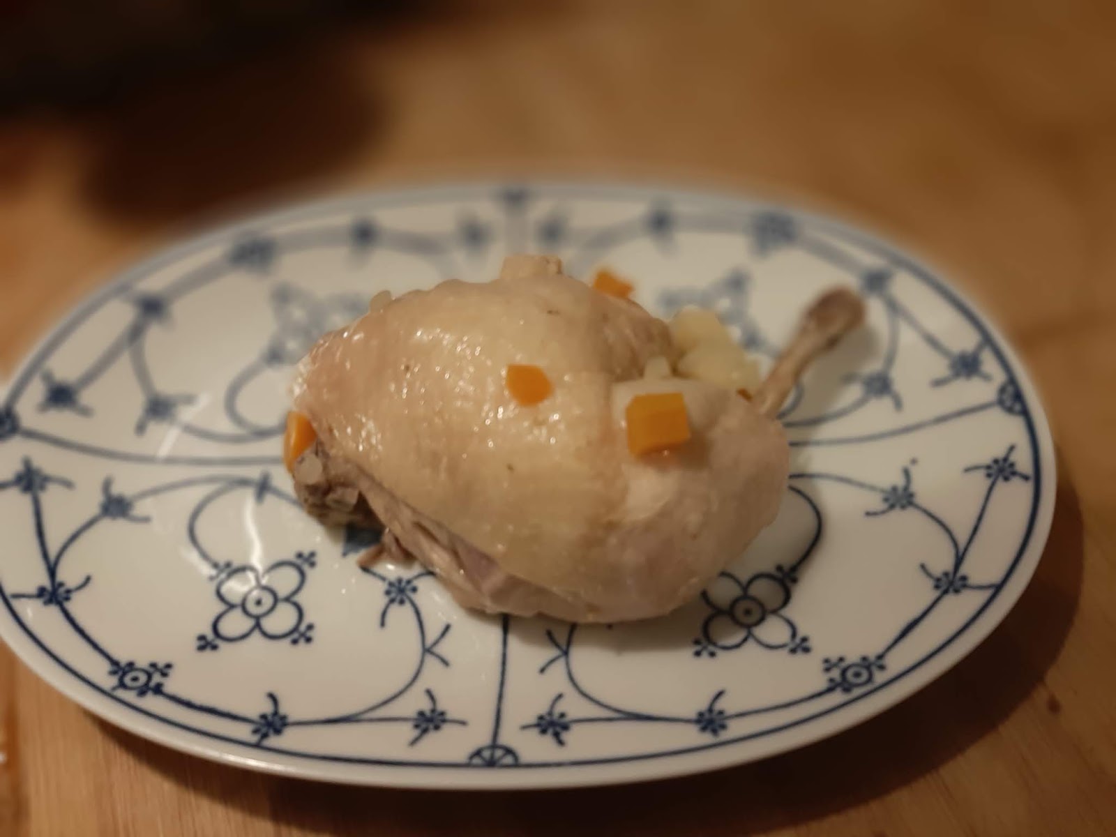 • Измивам много добре пилешкото бутче и премахвам останалите пера и излишните мазнини. Някои от Вас могат да предпочетат и да премахнат изцяло кожата, но да знаете, че точно там са и най-вкусните мазнини за една пилешка супа. Така, че аз предпочитам да изчистя всичко много добре и да оставя кожата.