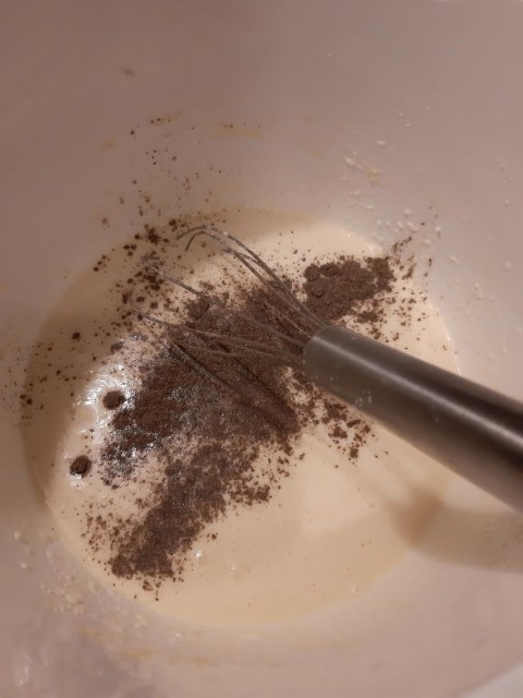 - В купа разбивам двете яйца със сметаната и настъргания пармезан. Подправям обилно с черен пипер.