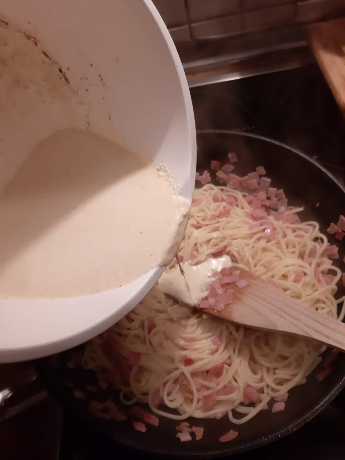 - Когато спагетите са готови, започвам да добавям на три – четири пъти от тях към шунката. Спагетите не ги прецеждам от течността, а напротив. Старая се от водата, в която са врели да попадне по-голямо количество към бъдещия сос Карбонара. Нямам измерено определено количество, но и повече вода да попадне – не се безпокойте особено, ако обичате повече сос.